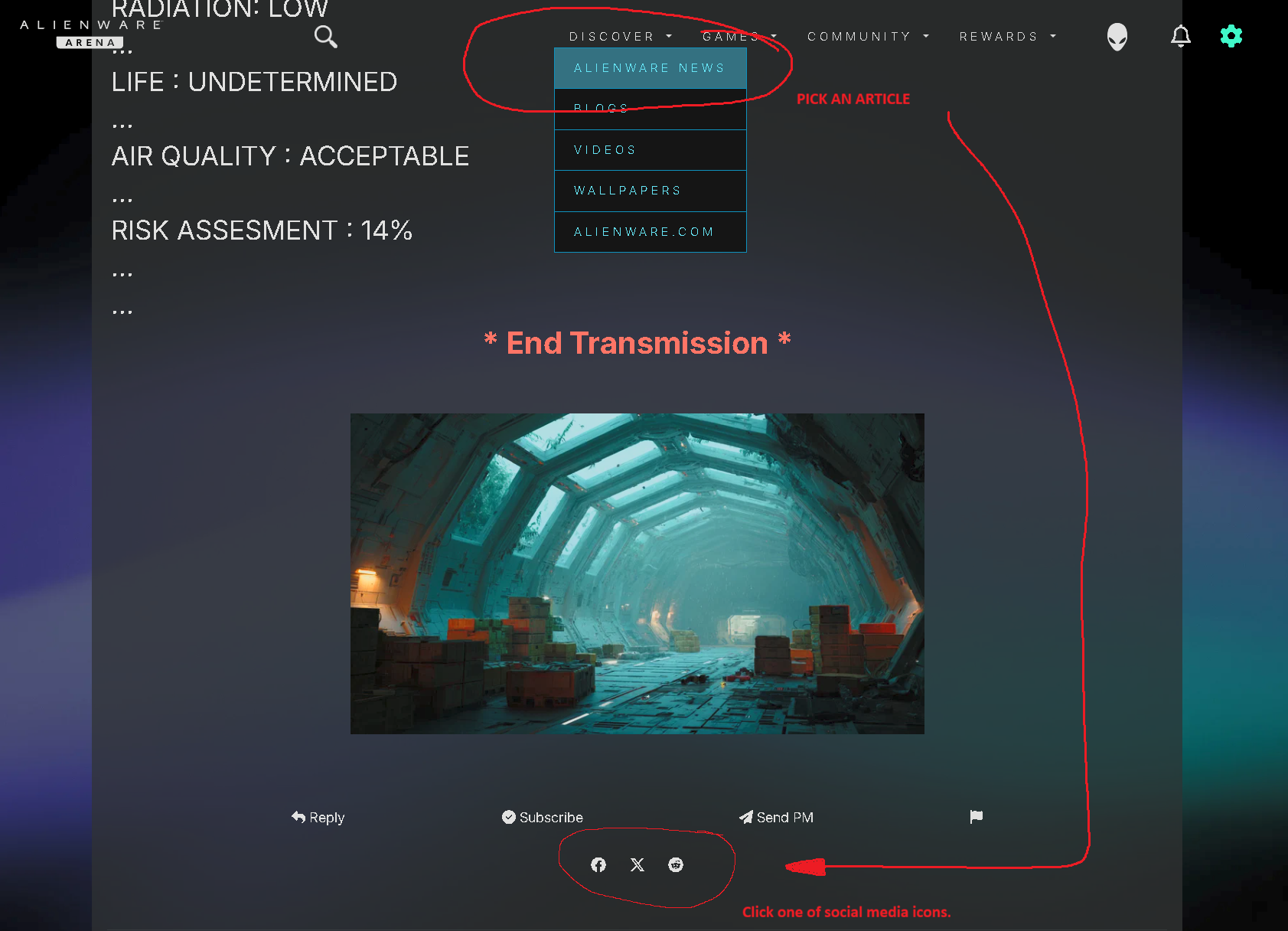 Share the love - Click any social media icon on the bottom of a news article.